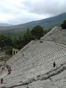 Le spectacle avait lieu à ciel ouvert dans un théâtre de forme hémicirculaire entouré de gradins. Les acteurs sont tous des hommes en grec ils sont appelé upocrites. Aux débuts, un seul acteur assume tous les rôles successivement. Chaque acteur porte un masque symbolisant le type de personnage joué (jeune homme, veille femme, etc.), des vêtements très colorés ainsi que des cothurnes (chaussures à semelles de bois épaisses), qui leur permettent d'être facilement distingués par l'ensemble du public. L'auteur de la pièce était à la fois metteur en scène et chorégraphe. Le chœur dont la fonction primordiale était de garantir le caractère sacré du théâtre assure l’unité de temps de la tragédie, sa continuité formelle, depuis son entrée (le parodos) jusqu’à la fin de l’exode. Entre les différents stasima (chant en place), le chœur ne quitte pas l’orkestra | ![]() |