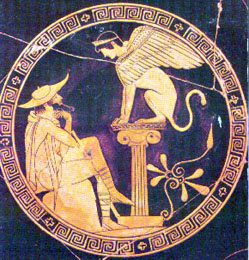 Le Sphinx était un monstre ailé, pourvu d'une tête de femme et d'un corps de lion. Il guettait ses victimes pour leur poser ses fameuses énigmes. Quand les voyageurs répondaient faux, ils étaient dévorés par le Sphinx. Oedipe fut le seul à répondre correctement aux énigmes et débarassa Thèbes du Sphinx qui se jeta dans une abîme.