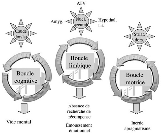 Dysfonctionnement des boucles motrice (abolition des actions spontanées) et cognitive (abolition de l'activité mentale spontanée) Figure 5