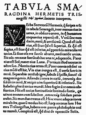 ![]() | «Il est vrai, sans mensonge, certain et très véritable : Ce qui est en bas est comme ce qui est en haut, et ce qui est en haut est comme ce qui est en bas ; par ces choses se font les miracles d'une seule chose. Et comme toutes les choses sont et proviennent d'un, par la méditation d'un, ainsi toutes les choses sont nées de cette chose unique par adaptation. Le Soleil en est le père, et la Lune la mère. Le vent l'a porté dans son ventre. La terre est sa nourrice et son réceptacle. [...]» | ![]() |